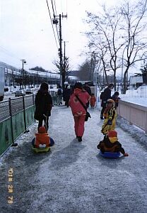 在雪祭的會場到處可見這種雪橇,看著「小人」乘坐在 上面身上又裹著胖嘟嘟的雪衣,好可愛喔!