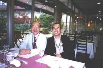 | 拍完照,有人請杏子簽名o也---好高興!這些中文系學生的中文呱呱叫,大家都很厲害哩! | 一直勸我進麗澤大學唸日文系的「千島英一」教授(左)和促進此次演講的大功臣ARUKU出版社的「古市」先生(右)。兩人是否很像兄弟呢?哈哈! |