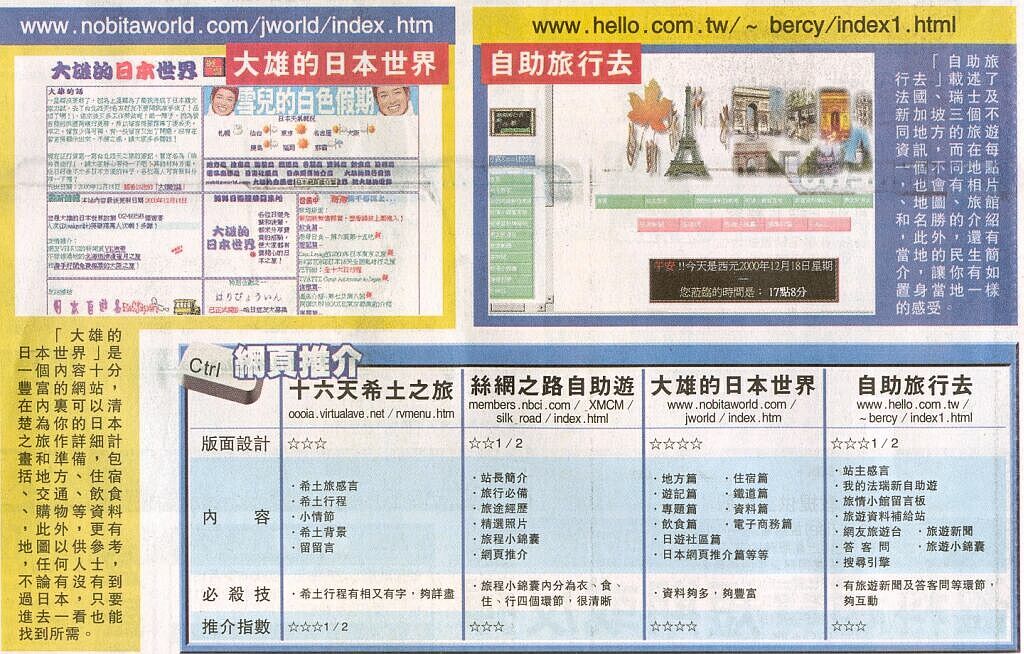 打從1993年夏天,從友人處借來一個2400bps的modem,用來連線打機,沒記錯的話,是為了玩"上帝也抓狂"(Populus)和"Doom"的 ,那時還要是在放大假應付考試期間的一段日子,好在打機之餘,考試的成績亦不錯。 1996年6月11至24日,大雄初次踏足夢寐以久的日本,進行「第一次日本之旅」。 隨著modem的速度越來越快,友人亦弄了個bbs,名為「Twilight Zone」,於是更常佔了屋企的電話線去上bbs找人傾計,和玩玩連線遊戲。 到了1997年1月15日,首次寫了個網頁放在netvigator.com的user web space,命名為「大雄的閒人世界」。簡單的版面設計,單薄的網頁內容是個人興趣,講下日劇、動畫諸如此類。但從1998年至1999年兩年間,都係得個殼,無 甚更新,無甚內容。 1998年10月22日至11月4日及1999年9月11至26日,大雄分別進行了「第二次日本之旅」及「第三次日本之旅」。 2000年1月3日,去日本也去了三次,累積了點日遊經歷,於是寫了點遊記和地方介紹,成立了「大雄的日本世界」,而網頁還是掛在netvigator.com的user web space處。同年農曆年前,替友人Steven的年宵生意增設「開運貓館」網頁以作宣傳。 過了幾個月,常去的「日本自助遊」網頁成立了正式的網站ec2japan.com。當時請教過網主sandy一些關於建立網站難不難的問題,發覺原來不難,如是者,2000年4月1日,正式擁有了nobitaworld.com的網站。當時的內容仍以「大雄的閒人世界」 來說點自己的事和「大雄的日本世界」去分享日遊經歷。4月10日終於完成了網頁內容轉移的工作,並分成「大雄的閒人世界」、「大雄的日本世界」及「大雄的香港世界」 等部份,28日完成了登錄網址於各主要搜尋器網站和加上了thecounter.com瀏覽人數counter。 2000年5月14日,寫了個「金文泰中學校友會專頁」,談談中學母校的一點東西。(註:網頁已刪除了)。7月13日參加了"網盟"(註:己取消參加);9月4日參加了HK GO Where top site;同年9月亦成立了以"哈日病院"為名的哈日杏子讀友會;10月23日成為了e-Oscar的優質網站。 2000年12月12日,在網站加上了J Walker雜誌的廣告連結;12月29日,星島日報的「網站追蹤」作出介紹,「大雄的日本世界」初次見報。 2000年12月30日,為了整合過多的主題,成立了"nobitaworld.com導航頁"於頂層網頁。 2001年1月,「大雄的日本世界」廣告初次出現於J Walker雜誌上。2月4日新增了「大頭妹日記」連結;3月7日新增了「貓骨的個人天地」連結。3月,參加了ValueCommerce(註:已取消)。 2001年6月8至14日,獲台灣的入門網站「雅虎奇摩」的新奇週選作了一星期的推介,網頁瀏覽人次升至一週2699人次,突破單日586人次的記錄。 2001年6月至年底,以大雄的名義,替台灣尖端出版社出版的「Cool Toys玩具酷報」雜誌撰寫介紹香港玩具店的稿子。 2001年8月6日,為網站增設Nedstat網頁統計器於「大雄的日本世界」。2001年10月14日,與日本自遊易合辦了「第二次網聚」,共15人參加。(註:第一次網聚記錄已不詳) 2001年11月10至15日,大雄了以採購商品為名去了一趟「第四次日本之旅」;12月8日,開設網上商店「和風商店」。 同年12月9日,舉行了「第三次網聚」,有12人出席。 2002年1月8日,舉行了「第四次網聚」,出席人數18人。 2002年1月14日,第123期的「新假期」雜誌的副刊「料王」「玩online」一欄介紹www.nobitaworld.com[1 / 2 / 3 ] ;同年3月20日,增設talk.allAbout.japan新聞組。4月17日,新增「何故之部屋」連結;10月8日,新增「香港迷」連結。 2002年4月20日,「第五次日遊聚會」舉行,共27人參加;9月29日,舉行了「第六次日遊聚會」,出席人數43人,創參加人數新高點。 2003年3月19日,新增「小妹的私房網」連結;7月16日新增trendybay.com連結(註:已取消連結)。 而於2003年3月23日,舉行了「第七次日遊聚會」,在風雨飄搖的SARS陰霾下,亦有39人出席。 2003年7月25日全面取消thecounter.com的瀏覽人數統計器,改用Nedstat。截至當日,各網站的瀏覽人數為: 2003年8月11日,新增「導師網hktutornet」(註:已取消連結)。 2003年9月21日,與網友舉行「第八次日遊聚會」,人數為歷年之最的66人。 2003年10月5日至16日,貓骨與大雄去了一趟「西本州北九州之旅」。 2003年底至2004年初,網站更新緩慢,至2004年3月,因轉換web hosting公司及網站連作多年內容冗贅,於是趁機會更新網站,但由於籌備5月21日的婚禮,所以更新少之又少,而"急就章"的新版面令網友覺得不清晰、太多banner。 2004月5月23至6月6日,貓骨與大雄去了北海道完成「北海道蜜月之旅」。 2004月10月5日,終於推出2003年的「西本州北九州之旅2003」遊記。 2004年11月14日,與一眾網友舉行「第九次日遊聚會」,共56人出席。 2005年5月,推出「北海道蜜月之旅2004」遊記,第1至6日完全版及7至16日的文字版。 2005年5月9至22日,貓骨與大雄去了本州東北,度過「1st Anniversary東北之旅」的周年紀念之旅,旅途中寫了其中9天的即日遊記。至7月中只完成多1天,即至第10天。6月18日,舉行「第10次日遊聚會」,48人出席。 至2005年9月4日,nobitaworld.com頂層網頁的瀏覽人次為 477,825(以Nedstat計算由2001年8月16日起計) 從今以後 近日閒來,回首一下,一轉身竟已成為一個有12年網歷的網民,弄網頁好說也有8年的經驗了。綜合經驗,"造"網不難,眼見很多認識已久的網頁都紛紛"成家立業"(造了網站出來,亦成為了網站的CEO),網絡的社群亦越來越大,但弄網最大的阻力在於恆心。有事百日不寫,但一時間又會字如雪花,寫一篇長篇大論來。 懶了這麼多年,都係要再整理一下網